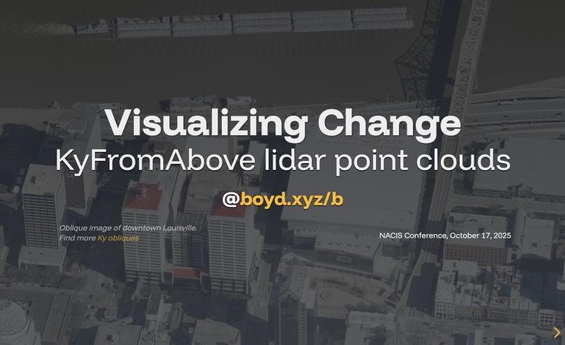 A presentation for the NACIS Annual Conference at the Galt House, Louisville, KY, October 15-19, 2025. The presentation introduces KyFromAbove imagery and elevation data and provides a method to colorize point clouds based on the surface change in an area of interest.